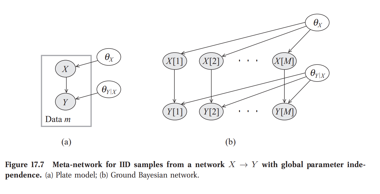 To perform Bayesian parameter estimation of a Bayesian Network, one has to specify a joint probability distribution of the unknown parameters and observables. Koller and Friedman (2009) refers to it as adding a meta-network for learning. Assumes global parameter independence, i.e. priors for parameters do not depend on each other. This allows taking expectations over parameters when making predictions independently and then combine the results when making predictions.