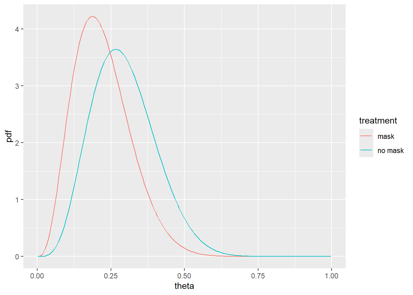 df <- data.frame(theta=pp,pdf=c(dbeta(pp,a_mask,b_mask),dbeta(pp,a_nomask,b_nomask)),treatment=rep(c("mask","no mask"),each=200))